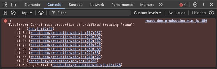 These kinds of errors are harder to diagnose since they can be caused due to many kinds of runtime errors. The most common kind of runtime errors in Javascript are type errors and the most common type error is attempting to read a property from an undefined variable. Such an error would look like this in the developer console.